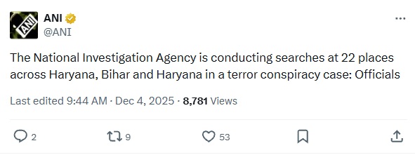 NIA ने हरियाणा, UP और बिहार में 22 जगहों पर छापेमारी की। अवैध हथियार-गोला बारूद तस्करी नेटवर्क पर कार्रवाई, दिल्ली ब्लास्ट केस से तार जुड़ने की जांच जारी।