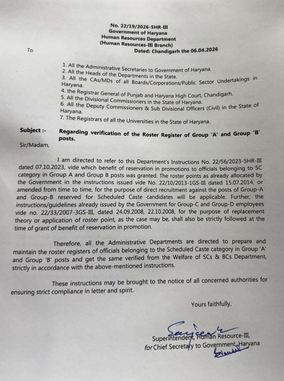 हरियाणा सरकार ने SC आरक्षण को प्रभावी बनाने के लिए सभी विभागों को रोस्टर रजिस्टर अपडेट और सत्यापन के आदेश दिए हैं तथा रिप्लेसमेंट थ्योरी लागू करने पर जोर दिया है।